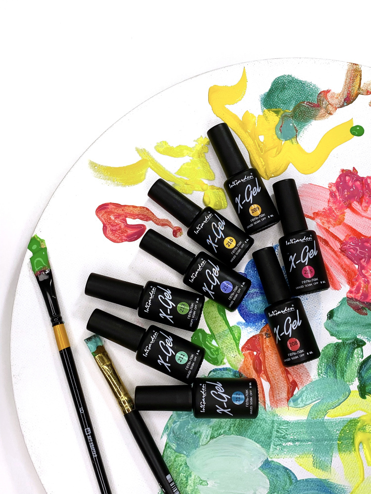 - Палитра гель-лаков In'Garden X-gel имеет густую консистенцию, поэтому может давать умеренный объем покрытия, что необходимо учитывать при выравнивании и укреплении ногтей.